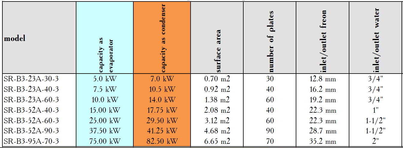 Schimbătorul de căldură SR-B3-23A-60-3 este conceput pentru aplicații frigorifice comerciale de mică și medie capacitate, oferind un transfer termic excelent între circuitele de freon și apă.